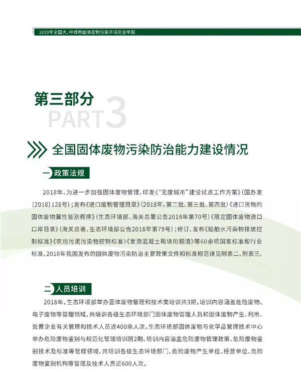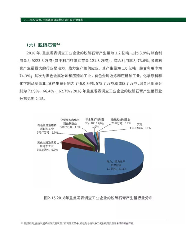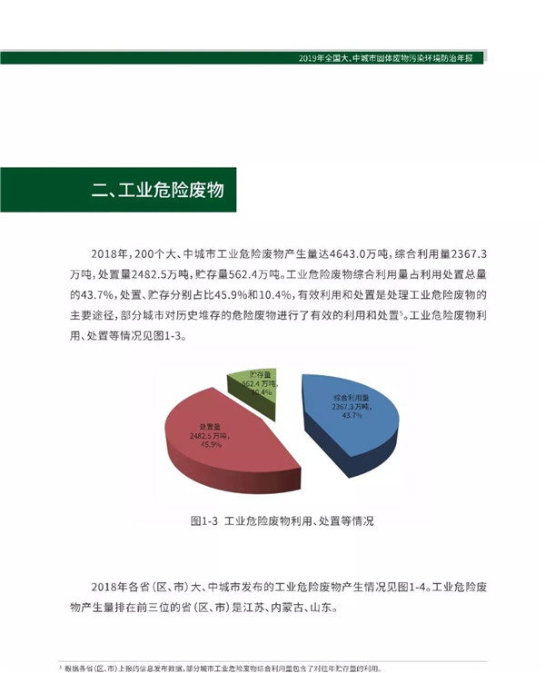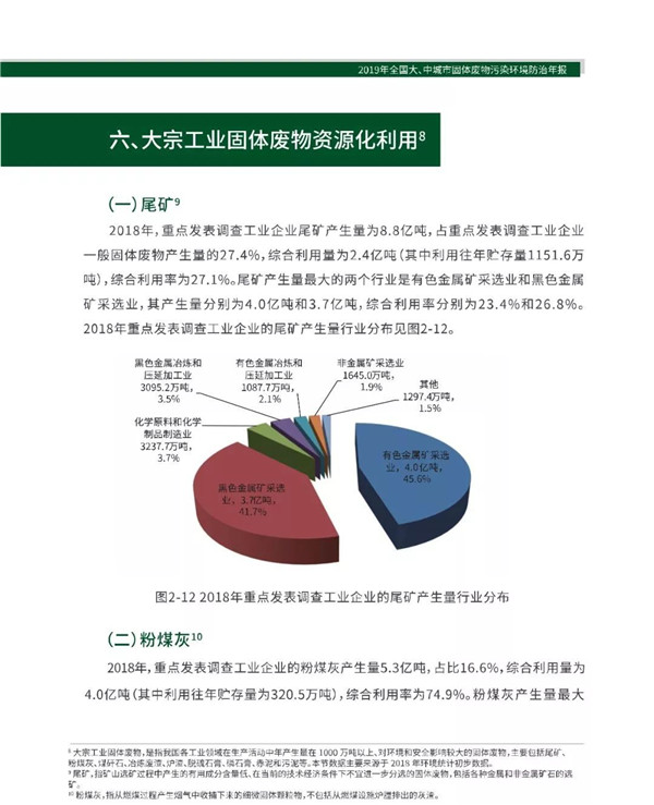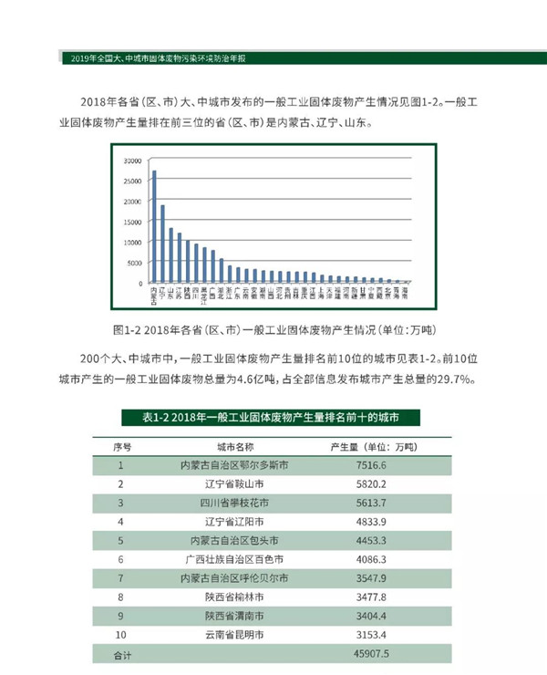 近日,《2019年全國大、中城市固體廢物污染環境防治年報》公布,2019固廢年報顯示:2018年,200個大、中城市一般工業固體廢物產生量達15.5億噸,綜合利用量8.6億噸,處置量3.9億噸,貯存量8.1億噸,傾倒丟棄量4.6萬噸。一般工業固體廢物綜合利用量占利用處置總量的41.7%,處置和貯存分別占比18.9%和39.3%,綜合利用仍然是處理一般工業固體廢物的主要途徑。